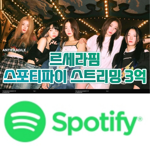 오늘(23일) 세계 최대 음악 스트리밍 업체 스포티파이가 발표한 최신 데이터(7월 21일 자)에 따르면, 르세라핌(김채원, 벚꽃, 허윤진, 카즈하, 홍은채)의 미니 2집 타이틀곡 ‘ANTIFRAGILE’(안티프래자일)이 누적 재생수 3억 회를 돌파했다. 이 곡은 올 3월 스포티파이에서 2억 스트리밍을 기록한 데 이어 4개월 만에 1억 회를 추가했다.