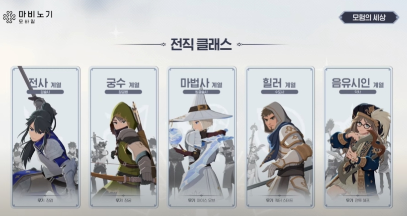 마비노기 모바일은 전사,궁수,마법사,힐러,음유시인 이렇게 총 5가지 계열의 클래스가 있습니다.