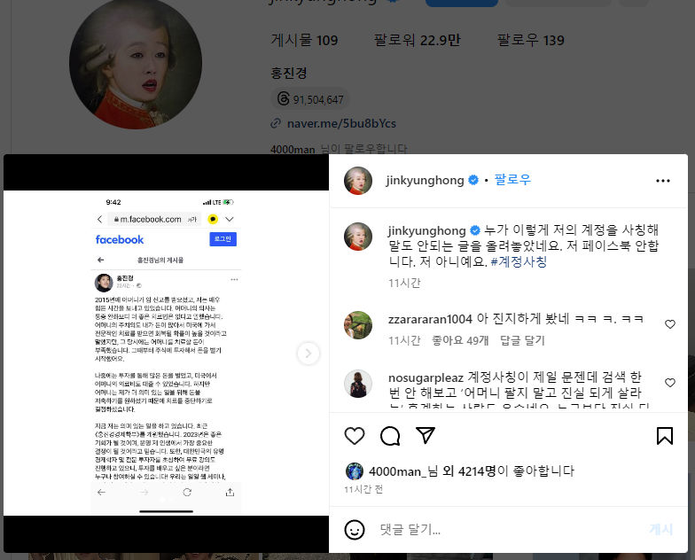 홍진경은 사칭 계정의 게시물도 공유하여 해당 계정이 어떻게 자신을 사칭하고 있는지 노출했습니다. 사칭범은 홍진경의 이름과 프로필 사진을 사용하여 그를 사칭한 것으로 나타났습니다.