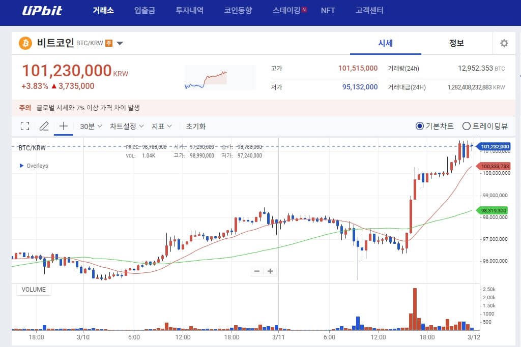 2024년 3월 11일, 비트코인 가격이 역대 최고치인 1억 원을 돌파했습니다. 이는 지난 2017년 12월 17일에 기록한 역대 최고치 8270만 원을 훨씬 뛰어넘는 수치입니다.