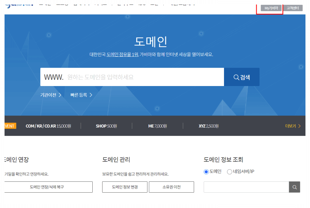1. 가비아도메인 사이트로 간다. 메인 화면 맨 오른쪽 위에 '마이 가비아' 선택