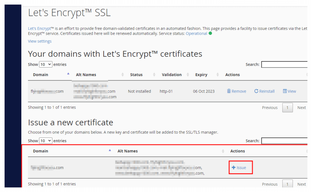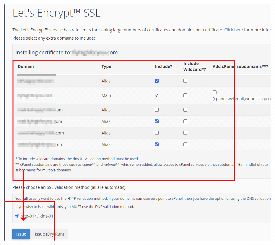 이 화면에선 세부적인 설정창이 나오는데 왼쪽 편에 추가한 가비아 도메인 주소 모두를 선택 체크해 주고 한 번 더 issue 클릭.