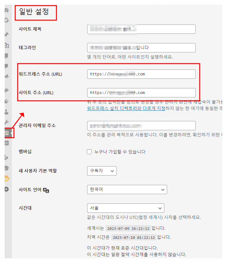 9. 워드프레스알림판 설정 ▶일반설정에서 워프주소와 사이트주소 란에 새로 바꾼 가비아 도메인을 설정한다.