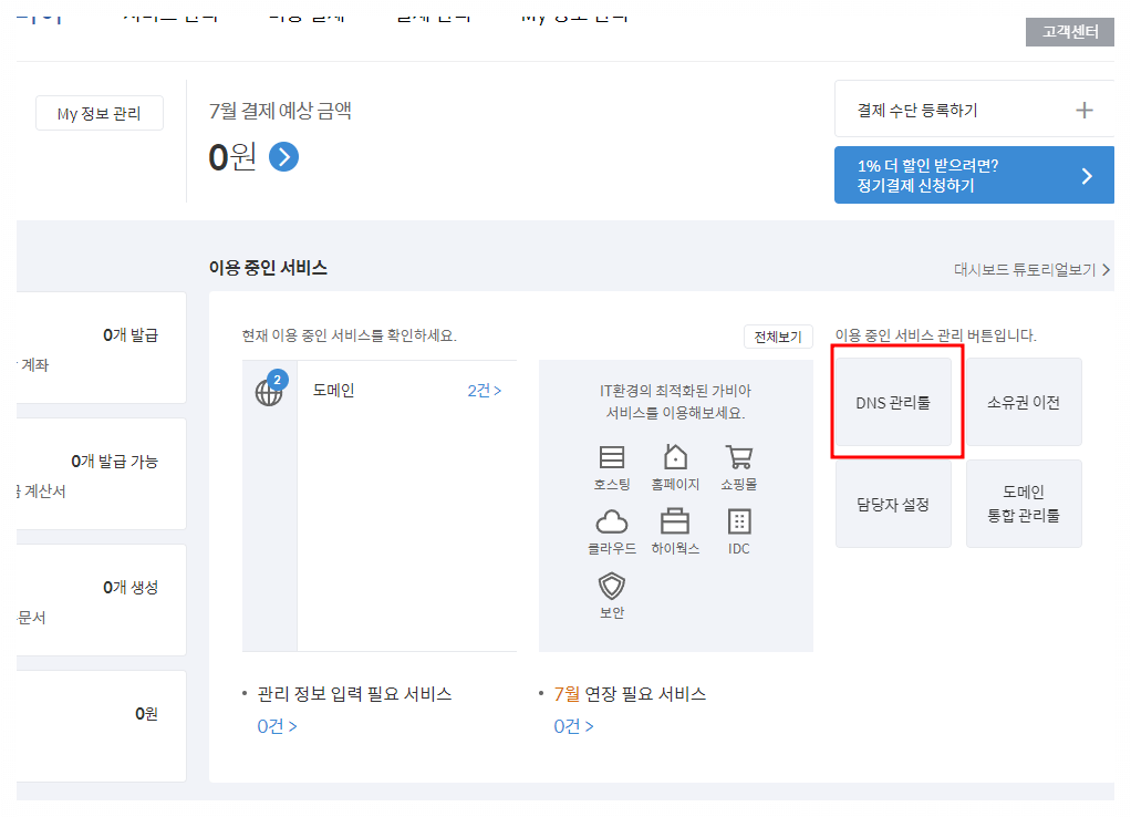 3. 연결하고자 하는 '도메인'을 선택하고 'DNS설정'으로 들어간다.
