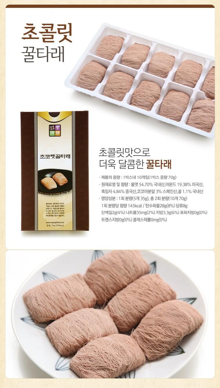 꿀타래엿은 한국의 전통적인 과자로 찹쌀가루를 이용해 만든 타래를 말린 후 꿀에 절여 달콤하고 부드러운 맛이 특징인 음식이다. 국산미청으로 만든 탕진엿 100% 천일염으로 삶아낸 자색고구마와 밤등 다양한 재료가 들어가고 인공보존료나 화학첨가제 없이 제조되므로 건강에도 좋다.