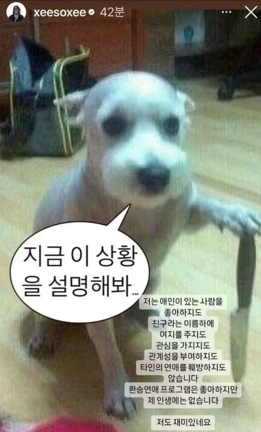 15일 한소희는 자신의 인스타그램 스토리에 "저는 애인이 있는 사람을 좋아하지도, 친구라는 이름하에 여지를 주지도, 관심을 가지지도, 관계성을 부여하지도, 타인의 연애를 훼방하지도 않습니다"라며 "환승연애 프로그램은 좋아하지만 제 인생에는 없습니다. 저도 재미있네요"라고 했다.