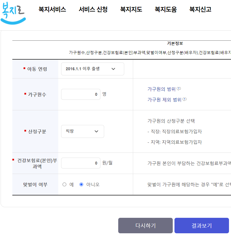 판정기준: 건강보험료 본인부담금 부과액 기준으로 월평균 가구소득 금액을 산정합니다.