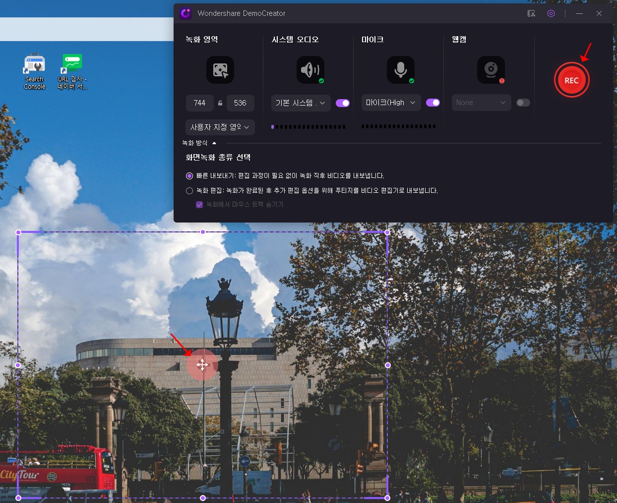 3. 점선으로 된 사각선을 영상녹화 위치에 옮겨 크기를 조절하고 녹화버튼을 누릅니다.