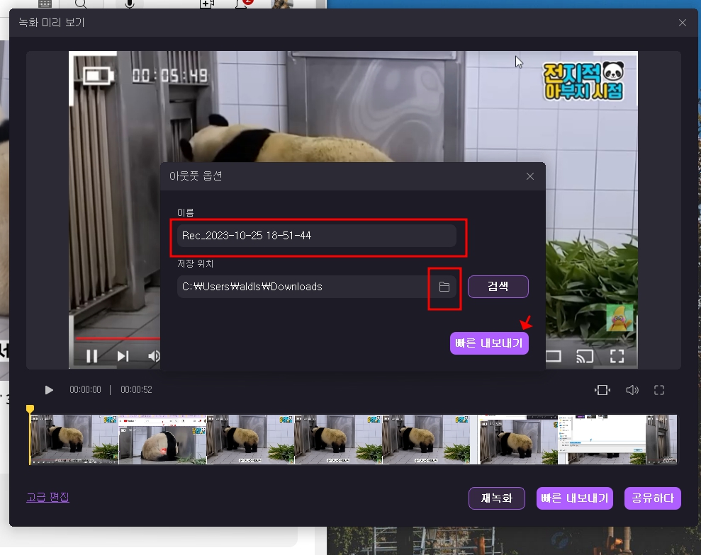 6. 녹화본을 저장할 위치를 지정하고 제목을 입력 후 빠른 보내기를 클릭합니다.
