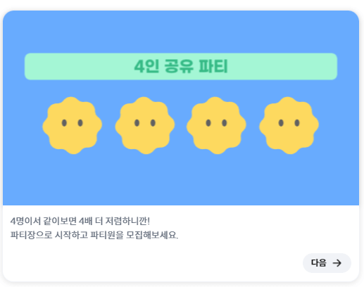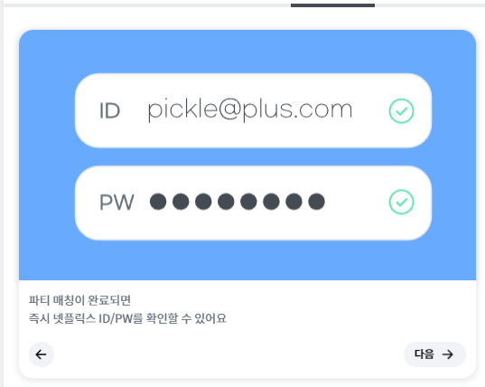파티장이 아닌 파티원으로 하게 되면 사람들과 매칭되는 대기시간이 존재하며 매칭이 완료되면 파티장의 계정을 공유받을 수 있으며 4인팟에 들어가 결제를 마무리하면 저렴한 가격으로 볼 수가 있다.