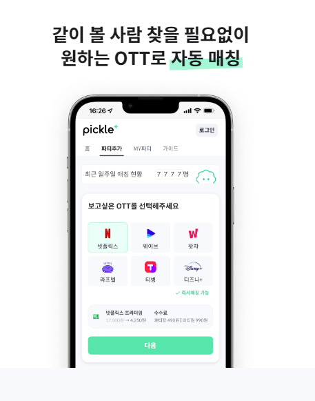 안심 계정 셰어 사이트 '피클플러스'는 4인 파티를 구성해 저렴한 구독료로 OTT스트리밍을 골라 계정 공유를 할 수 있다.